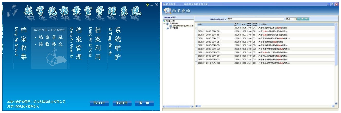 今年年初以来,在县档案局指导下,滨海供水公司档案工作有了较大提高,数字档案室建设基础良好,软、硬件条件完善,达到档案信息数字化标准。目前,档案室建有文书、会计、用户、工程、人事、设备、声像等7大类电子档案数据库及供水管网信息、综合水供水信息、小舜江供水信息、综合水用户信息、大事记、组织机构沿革等6个专题数据库,归档电子文件达20995件。同时,开通电子档案信息查询平台,并与办公自动化系统实现联通,可随时访问利用电子档案信息,进一步提升了供水信息化程度,提高了档案服务能力。