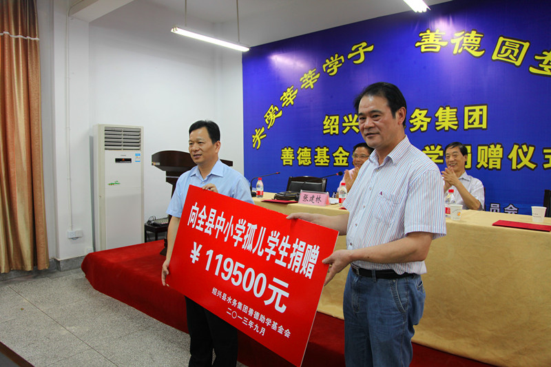 仪式上,集团倪董事长介绍了“善德基金”基本情况,并现场向今年受助的全县81名中小学孤儿学生捐赠了“善德基金”助学款119500元,资助标准为小学生每人每学年1000元,初中生每人每学年1500元,高中生每人每学年2000元,并从今年开始对全县孤儿从小学到高中读书期间每年给予捐助。县教体局局长蒋国洪以及县老领导、县关工委主任李会鹏分别作了讲话,他们对集团强烈的社会责任感以及情系困难学生的善心义举给予了高度的肯定和赞扬,希望受助学生学会坚守,学会感恩,学会奉献,并呼吁社会各界为孩子们快乐成长、展翅高飞而共同努力。
