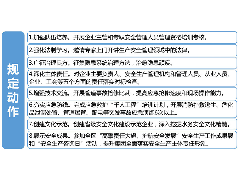 本届安全生产文化月以宣传贯彻中共中央国务院《关于推进安全生产领域改革发展的意见》为主线,以“全面落实企业安全生产主体责任”为主题,以创建省级安全文化建设示范企业为契机,立足集团公司“四全、四化”安全体系建设中心,通过开展八项“规定动作”和七项“特色活动”,强化安全“红线”意识,弘扬水务安全文化,为促进集团可持续安全健康发展提供有力的思想保证、文化条件和舆论支持。