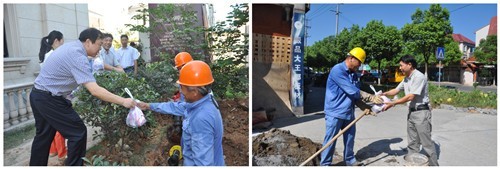 7月17日上午,集团公司党委副书记、纪委书记高小林、副总经理王嘉贤在公司领导的陪同下,到城区唯美品格紫薇园和紫郡花园工地现场慰问供水一线职工,送上防暑慰问品,并叮嘱大家在高温酷暑下作业要注意做好防暑措施。
