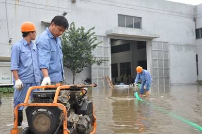 10月9日上午9点,公司接到位于安昌镇的杰杰纺织有限公司的求助电话,该公司受台风“菲特”影响,厂区内积水严重,请求协助排水。